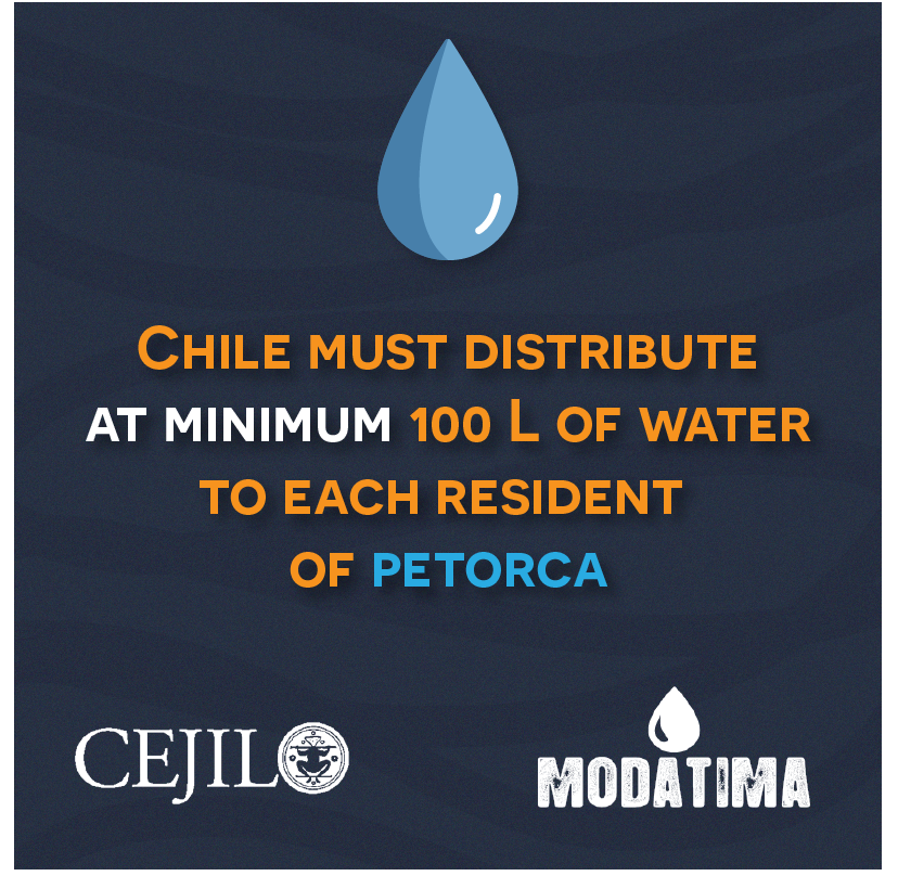 We urge the Chilean government to guarantee a minimum of 100 liters of clean water each day to every inhabitant of the communities affected by water scarcity. To do this, we demand that the Inter-American Commission on Human Rights (IACHR) provide prevention methods to benefit the communities of the communes of Petorca, La Ligua and Cabildo so that they receive sufficient water as well as good quality medical attention, a permanent control on the water quality and the progressive implementation of integrated methods to resolve the root of the problem.